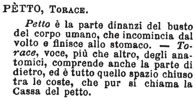 | Petto, Torace - Petto è la parte dinanzi del busto del corpo umano, che incomincia dal volto e finisce allo stomaco. - Torace, voce, più che altro, degli anatomici, comprende anche la parte di dietro, ed è tutto quello spazio chiuso tra le coste, che pur si chiama la Cassa del petto. [immagine] |