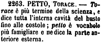 | Petto, Torace - Torace è più temine della scienza, e dice tutta l'interna cavità del busto fino alle costole; petto è vocabolo più famigliare e ne dice la parte anteriore esterna. [immagine] |