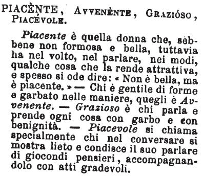 | Piacente, Avvenente, Grazioso, Piacevole - Piacente è quella donna che, sebbene non formosa e bella, tuttavia ha nel volto, nel parlare, nei modi, qualche cosa che la rende attrattiva, e spesso si ode dire: «Non è bella, ma è piacente.» - Chi è gentile di forme e garbato nelle maniere, quegli è Avvenente - Grazioso è chi parla e prende ogni cosa con garbo e con beninignità. - Piacevole si chiama specialmente chi nel conversare si mostra lieto e condisce il suo parlare di giocondi pensieri, accompagnandolo con atti gradevoli. [immagine] |