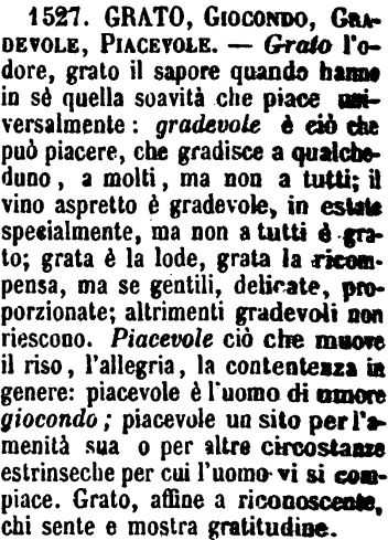 | Grato, Giocondo, Gradevole, Piacevole - Grato l'odore, grato il sapore quando hanno in sè quella soavità che piace universalmente: gradevole è ciò che può piacere, che gradisce a qualcheduno, a molti, ma non a tutti; il vino aspretto è gradevole, in estate specialmente, ma non a tutti è grato; grata è la lode, grata la ricompensa, ma se gentili, delicate, proporzionate; altrimenti gradevoli non riescono. Piacevole ciò che muove il riso, l'allegria, la contentezza in genere: piacevole è l'uomo di umore giocondo; piacevole un sito per l'amenità sua o per altre circostanze estrinseche per cui l'uomo vi si compiace. Grato, affine a riconoscente, chi sente e mostra gratitudine. [immagine] |