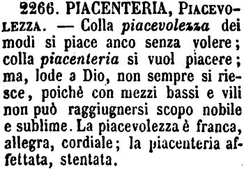 | Piacenteria, Piacevolezza - Colla piacevolezza dei modi si piace anco senza volere; colla piacenteria si vuol piacere; ma, lode a Dio, non sempre si riesce, poichè con mezzi bassi e vili non può raggiugnersi scopo nobile e sublime. La piacevolezza è franca, allegra, cordiale; la piacenteria affettata, stentata. [immagine] |