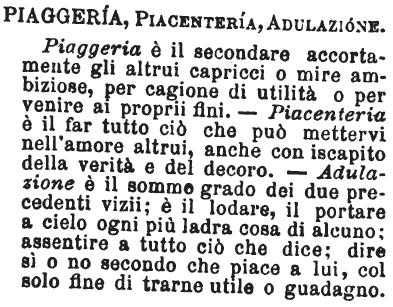 | Piaggeria, Piacenteria, Adulazione - Piaggeria è il secondare accortamente gli altrui capricci o mire ambiziose, per cagione di utilità o per venire ai proprii fini. - Piacenteria è il far tutto ciò che può mettervi nell'amore altrui, anche con iscapito della verità e del decoro. - Adulazione è il sommo grado dei due precedenti vizii; è il lodare, il portare a cielo ogni più ladra cosa di alcuno; assentire a tutto ciò che dice; dire sì o no secondo che piace a lui, col solo fine di trarne utile o guadagno. [immagine] |