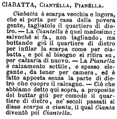 | Ciabatta, Ciantella, Pianella - Ciabatta è scarpa vecchia e logora, che si porta per casa dalla povera gente, tagliatole il quartiere di dietro. - La Ciantella è quel medesimo; salvochè si fa, non tagliando, ma buttando giù il quartiere di dietro per infilar la scarpa come per ciabatta, e poi al bisogno si ritira su, per calzarla di nuovo. - La Pianella è calzamento sottie, e spesso elegante, da tener per camera, ed è fatto apposta senza la parte di dietro che cuopre il calcagno. - Ciò che abbiamo detto qui sopra, a proposito del buttar giù per comodo il quartiere di dietro, ne' secoli passati si disse scarpa a cianta, il qual Cianta diventò poi Ciantella. [immagine] |