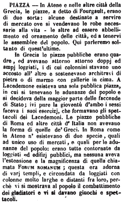 In Grecia le piazze pubbliche erano quadre, ed avevano attorno attorno doppj ed ampj loggiati, i di cui colonnini stavano uno accosto all'altro e sostenevano architravi di pietra o di marmo con gallerie in cima. A Lacedemone esisteva una sola pubblica piazza, in cui si tenevano le adunanze del popolo e si decideva della maggior parte delle faccende di Stato; ivi pure la gioventù d'ambo i sessi faceva i suoi esercizj, che formavano gli spettacoli dei Lacedemoni. Le piazze pubbliche di Roma ed altre città d'Italia non avevano la forma di quelle de' Greci. In Roma come in Atene n'esistevano di due specie, quali ad unico uso di mercati, e quali per le adunanze del popolo: erano tutte contornate da loggiati ed edifizj pubblici, ma nessuna aveva l'estensione e la magnificenza di quella chiamata Forum romanum; questa era adorna di varj templi, e circondata da loggiati con colonne molto larghe e distanti fra loro, perché vi si mostrava al popolo il combattimento dei gladiatori e vi si davano giuochi e spettacoli. [immagine] |