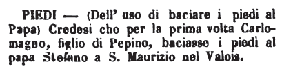 | Piedi - (Dell'uso di baciare i piedi al Papa) Credesi che per la prima volta Carlomagno, figlio di Pepino, baciasse i piedi al papa Stefano a S. Maurizio nel Valois. [immagine] |