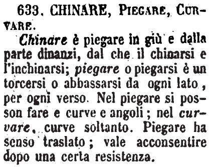 | Chinare, Piegare, Curvare - Chinare è piegare in giù e dalla parte dinanzi, dal che il chinarsi e l'inchinarsi; piegare o piegarsi è un torcersi o abbassarsi da ogni lato, per ogni verso. Nel piegare si posson fare e curve e angoli; nel curvare, curve soltanto. Piegare ha senso traslato; vale acconsentire dopo una certa resistenza. [immagine] |