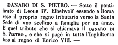 | Danaro di S. Pietro - Sotto il pontificato di Leone IV. Ethelwolf essendo a Roma rese il proprio regno tributario verso la Santa Sede di uno scellino a famiglia per un anno. E' quel tributo che si chiamava il danaro di S. Pietro, e che si pagò in tutta l'Inghilterra fino al regno di Enrico VIII. [immagine] |