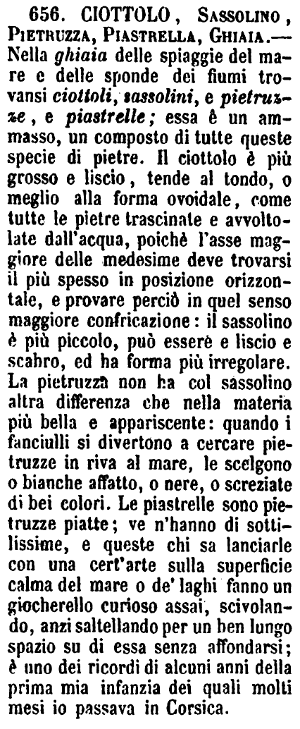| Ciottolo, Sassolino, Pietruzza, Piastrella, Ghiaia - Nella ghiaia delle spiagge del mare e delle sponde dei fiumi trovansi ciottoli, sassolini, e pietruzze, e piastrelle; essa è un ammasso, un composto di tutte queste specie di pietre. Il ciottolo è più grosso e liscio, tende al tondo, o meglio alla forma ovoidale, come tutte le pietre trascinate e avvoltolate dall'acqua, poichè l'asse maggiore delle medesime deve trovarsi il più spesso in posizione orizzontale, e provare perciò in quel senso maggiore confricazione: il sassolino è più piccolo, può essere e liscio e scabro, ed ha forma più irregolare. La pietruzza non ha col sassolino altra differenza che nella materia più bella e appariscente: quando i fanciulli si divertono a cercare pietruzze in riva al mare, le scelgono o bianche affatto, o nere, o screziate di bei colori. Le piastrelle sono pietruzze piatte; ve n'hanno di sottilissime, e queste chi sa lanciarle con una cert'arte sulla superficie calma del mare o de' laghi fanno un giocherello curioso assai, scivolando, anzi saltellando per un ben lungo spazio su di essa senza affondarsi; è uno dei ricordi di alcuni anni della prima mia infanzia dei quali molti mesi io passava in Corsica. [immagine] |