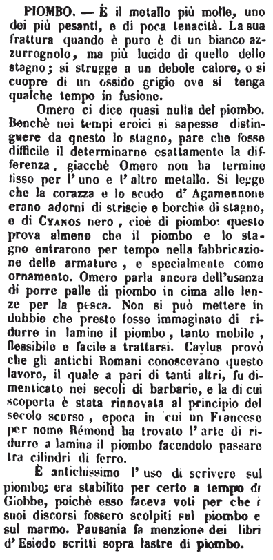 Omero ci dice quasi nulla del piombo. Benchè nei tempi eroici si sapesse distinguere da questo lo stagno, pare che fosse difficile il determinarne esattamente la differenza, giacchè Omero non ha termine fisso per l'uno e l'altro metallo. Si legge che la corazza e lo scudo d'Agamennone erano adorni di striscie e borchie di stagno, e di Cyanos nero, cioè di piombo: questo prova almeno che il piombo e lo stagno entrarono per tempo nella fabbricazione delle armature, e specialmente come ornamento. Omero parla ancora dell'usanza di porre palle di piombo in cima alle lenze per la pesca. Non si può mettere in dubbio che presto fosse immaginato di ridurre in lamine il piombo, tanto mobile, flessibile e facile a trattarsi. Caylus provò che gli antichi Romani conoscevano questo lavoro, il quale a pari di tanti altri, fu dimenticato nei secoli di barbarie, e la di cui scoperta è stata rinnovata al principio del secolo scorso, epoca in cui un Francese per nome Rémond ha trovato l'arte di ridurre a lamina il piombo facendolo passare tra cilindri di ferro. E' antichissimo l'uso di scrivere sul piombo; era stabilito per certo a tempo di Giobbe, poichè esso faceva voti per che i suoi discorsi fossero scolpiti sul piombo e sul marmo. Pausania fa menzione dei libri d'Esiodo scritti sopra lastre di piombo. [immagine] |