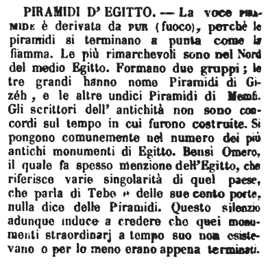 | Piramidi d’Egitto - La voce piramide è derivata da pur (fuoco), perchè le piramidi si terminano a punta come la fiamma. Le più rimarchevoli sono nel Nord del medio Egitto. Formano due gruppi; le tre grandi hanno nome Piramidi di Gizéh, e le altre undici Piramidi di Memfi. Gli scrittori dell'antichità non sono concordi sul tempo in cui furono costruite. Si pongono comunemente nel numero dei più antichi monumenti di Egitto. Bensì Omero, il quale fa spesso menzione dell'Egitto, che riferisce varie singolarità di quel paese, che parla di Tebe e delle sue cento porte, nulla dice delle Piramidi. Questo silenzio adunque induce a credere che quei monumenti straordinarj a tempo suo non esistevano o per lo meno erano appena terminati. [immagine] |
