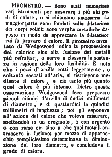 | Pirometro - Sono stati immaginati varj istrumenti per misurare i più alti gradi di calore, e si chiamano pirometri. La maggior parte sono fondati sulla dilatazione dei corpi solidi: sono verghe metalliche disposte in modo da apprezzare la dilatazione cui fa provare il calore. Il pirometro inventato da Wedgewood indica la progressione del calorico sino alla fusione dei metalli più refrattarj, e serve a classare le sostanze in ragione della loro fusibilità. E' noto che i pezzi d'arzilla cotti leggermente, o soltanto seccati all'aria, si ristringono mediante il calore, e ciò tanto più quanto quel calore è più intenso. Dietro questa osservazione Wedgewood fece preparare piccoli cilindri d'arzilla di dodici millimetri di diametro, e di quattordici in quindici millimetri di lunghezza; poi gli esponeva all'azione del calore che voleva misurare, mettendoli in un crogiuolo, o con argento o con rame ec: sino a che quei metalli entrassero in fusione; per mezzo di apparecchio semplicissimo determinava la diminuzione del loro diametro, e concludeva il grado di calore. [immagine] |
