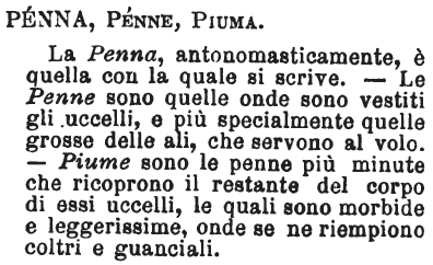 | Penna, Penne, Piuma - La Penna, antonomasticamente, è quella con la quale si scrive. - Le Penne sono quelle onde sono vestiti gli uccelli, e più specialmente quelle grosse delle ali, che servono al volo. - Piume sono le penne più minute che ricoprono il restante del corpo di essi uccelli, le quali sono morbide e leggerissime, onde se ne riempiono coltri e guanciali. [immagine] |