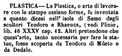 | Plastica - La Plastica, o arte di lavorare con le stampe ossiano forme, fu inventata a quanto dicesi nell'isola di Samo dagli scultori Teodoro e Rhaeucs, (vedi Plinio, lib. 46 XXXV cap. 12. Altri pretendono che quest'arte, tanto necessaria per fare le statue, fosse scoperta da Teodoro di Mileto e da Dedalo. [immagine] |