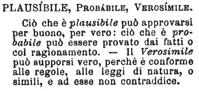 | Plausibile, Probabile, Verosimile - Ciò che è plausibile può approvarsi per buono, per vero: ciò che è probabile può essere provato dai fatti o col ragionamento. - Il Verosimile può supporsi vero, perchè è conforme alle regole, alle leggi di natura, o simili, e ad esse non contraddice. [immagine] |