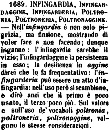 | Infingardia, Infingardaggine, Infingarderia, Poltronia, Poltroneria, Poltronaggine - Nell'infingardia è non solo pigrizia, ma finzione, mostrando di voler fare e non facendo; dunque inganno: l'infingardia sarebbe il vizio; l'infingardaggine la persistenza in esso; la desinenza in aggine direi che lo fa frequantativo: l'infingarderia può essere un atto d'infingardia: nell'uso però si scambiano, e dirò anzi che il primo è poco usato, il terzo poco più. Sul valore e sull'uso de' vocaboli poltronia, poltroneria, poltronaggine, valgono le stesse considerazioni. [immagine] |