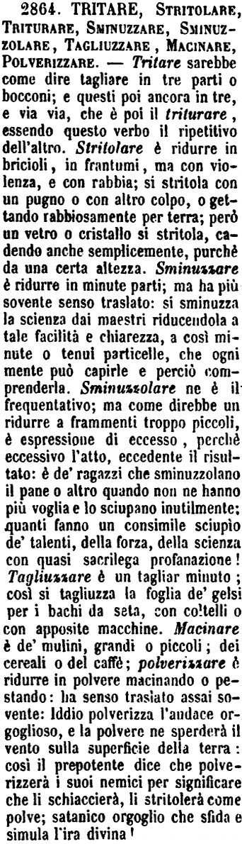 | Tritare, Stritolare, Triturare, Sminuzzare, Sminuzzolare, Tagliuzzare, Macinare, Polverizzare - Tritare sarebbe come dire tagliare in tre parti o bocconi; e questi poi ancora in tre, e via via, che è poi il triturare, essendo questo verbo il ripetitivo dell'altro. Stritolare è ridurre in bricioli, in frantumi, ma con violenza, e con rabbia; si stritola con un pugno o con altro colpo, o gettando rabbiosamente per terra; però un vetro o cristallo si stritola, cadendo anche semplicemente, purchè da una certa altezza. Sminuzzare è ridurre in minute parti; ma ha più sovente senso traslato: si sminuzza la scienza dai maestri riducendola a tale facilità e chiarezza, a così minute o tenui particelle, che ogni mente può capirle e perciò comprenderla. Sminuzzolare ne è il frequentativo; ma come direbbe un ridurre a frammenti troppo piccoli, è espressione di eccesso, perchè eccessivo l'atto, eccedente il risultato: è de' ragazzi che sminuzzolano il pane o altro quando non ne hanno più voglia e lo sciupano inutilmente; quanti fanno un consimile sciupìo de' talenti, della forza, della scienza con quasi sacrilega profanazione! Tagliuzzare è un tagliar minuto; così si tagliuzza la foglia de' gelsi per i bachi da seta, con coltelli o con apposite macchine. Macinare è de' mulini, grandi o piccoli; dei cereali o del caffè; polverizzare è ridurre in polvere macinando o pestando: ha senso traslato assai sovente: Iddio polverizza l'audace orgoglioso, e la polvere ne sperderà il vento sulla superficie della terra: così il prepotente dice che polverizzerà i suoi nemici per significare che li schiaccierà, li stritolerà come polve; satanico orgoglio che sfida e simula l'ira divina! [immagine] |