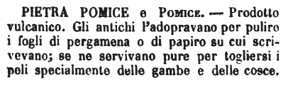 | Pietra pomice e Pomice - Prodotto vulcanico. Gli antichi l'adopravano per pulire i fogli di pergamena o di papiro su cui scrivevano; se ne servivano pure per togliersi i peli specialmente delle gambe e delle cosce. [immagine] |
