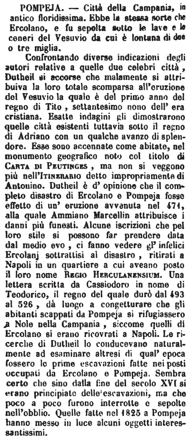 Confrontando diverse indicazioni degli autori relative a quelle due celebri città, Dutheil si accorse che malamente si attribuiva la loro totale scomparsa all'eruzione del Vesuvio la quale è del primo anno del regno di Tito, settantesimo nono dell'era cristiana. Esatte indagini gli dimostrarono quelle città esistenti tuttavia sotto il regno di Adriano con un qualche avanzo di splendore. Esse sono accennate come abitate, nel monumento geografico noto col titolo di Carta di Peutinges, ma non si veggono più nell'Itinerario detto impropriamente di Antonino. Dutheil è d'opinione che il completo disastro di Ercolano e Pompeja fosse effetto di un'eruzione avvenuta nel 471, alla quale Ammiano Marcellin attribuisce i danni più funesti. Alcune iscrizioni che pel loro stile si possono far prendere data dal medio evo, ci fanno vedere gl'infelici Ercolanj sottrattisi al disastro, ritirati a Napoli in un quartiere a cui aveano posto il loro nome Regio Herculanensium. Una lettera scritta da Cassiodoro in nome di Teodorico, il regno del quale durò dal 493 al 526, dà luogo a congetturare che gli abitanti scappati da Pompeja si rifugiassero a Nole nella Campania, siccome quelli di Ercolano si erano ricovrati a Napoli. Le ricerche di Dutheil lo conducevano naturalmente ad esaminare altresi di qual'epoca fossero le prime escavazioni fatte nei posti occupati da Ercolano e Pompeja. Sembra certo che sino dalla fine del secolo XVI si erano principiate delle escavazioni, ma che poco a poco furono interrotte e sepolte nell'obblio. Quelle fatte nel 1825 a Pompeja hanno messo in luce alcuni oggetti interessantissimi. [immagine] |