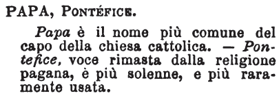 | Papa, Pontefice - Papa è il nome più comune del capo della chiesa cattolica. - Pontefice, voce rimasta dalla religione pagana, è più solenne, e più raramente usata. [immagine] |