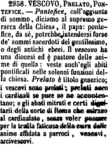 | Vescovo, Prelato, Pontefice - Pontefice, coll'aggiunta di sommo, diciamo al supremo gerarca della Chiesa, il papa: pontefice, da sè, potrebbe intendersi forse de' sommi sacerdoti del gentilesimo, o degli antichi ebrei. Il vescovo ha una diocesi ed è pastore delle anime di quella: veste anch'egli abiti pontificali nelle solenni funzioni della chiesa. Prelato è titolo generico; i vescovi sono prelati; prelati anco i cardinali se pure se ne accontentano; e gli abati mitrati e certi dignitarii della corte di Roma che mirano al cardinalato, senza voler passare per la trafila faticosa della cura delle anime affidata a parroci, vescovi, arcivescovi. [immagine] |