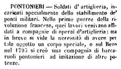 | Pontonieri - Soldati d'artiglieria, incaricati specialmente dello stabilimento de' ponti militari. Nelle prime guerre della rivoluzione francese, quei lavori venivano affidati a compagnie di operai d'artiglieria; ma in breve si vide la necessità di avere per tale oggetto un corpo speciale, e sul Reno nel 1795 si creò una compagnia di barcaruoli pontonieri ad imitazione di altre potenze. [immagine] |