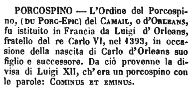 | Porcospino - L'ordine del Porcospino, (du Porc-Epic) del Camail, o d'Orleans, fu istituito in Francia da Luigi d'Orleans, fratello del re Carlo VI, nel 1393, in occasione della nascita di Carlo d'Orleans suo figlio e successore. Da ciò provenne la divisa di Luigi XII, ch'era un porcospino con le parole: Cominus et eminus. [immagine] |