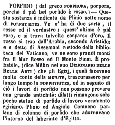 | Porfido - S. m. Gr. Πορφυρίτης. Genere di rocce, impropriamente aggiunto ai marmi. È una pasta di petrosalce rossa o rossiccia che inviluppa cristalli determinabili di feldspato. È durissimo quanto il granito, dal quale differisce pella composizione. Se ne contano quattro specie: Porfido rosso o bruno, con piccole macchie bianche; rosso di porpora, con macchie giallognole, ch'è il marmor Thebaicum degli antichi; rosso con macchie nere, il sycnites, stynites pyropecilon degli antichi, il nostro granito rosso. Il porfido si trova in moli immense nell'Egitto, nell'Arabia ed in alcune parti dell'Europa; dicesi anche nell'Inghilterra, nella Dalia orientale, nella Svezia. (Mt.) Porphyrites lat. preso dal gr. che deriva da Πορφύρα, Porpora, indica che dalla specie rossa ha il genere desunto il suo nome). Plin. Porphyrites. [Cont.] Imp. St. Nat. XXV. 8. Il Porfido è pietra dura, di color purpureo, sparsa di punti frequenti, bianchicci, partecipe alquanto della condizion granellosa, come sono alcune spezie di selci. Scam. V. Arch. univ. II. 183. 33. Molti vogliono che il porfido anticamente si cavasse nell'isola Citera ora Cerigo, la quale è dirimpetto al Golfo Laconico del Peloponeso, e però la addimandarono porfiride dalla città di cotal nome. = Bocc. Nov. 9. g. 6. (C) Essendo tra le colonne del porfido, che vi sono. Dant. Purg. 9. Lo terzo che di sopra s'ammassiccia, Porfido mi parea sì fiammeggiante, Come sangue che fuor di vena spiccia. Ricett. Fior. 1. 86. Le pietre, i lapislazzuli, l'armeno si macinano in mortajo, che abbia il fondo largo, con una macinetta, e l'uno e l'altra sia di porfido. Red. Esp. nat. 78. Un pezzetto di porfido inghiottito da una gallina, e tenuto due mesi nel ventriglio, non restò punto consumato. Borgh. Orig. Fir. 156. Cavandosi nel cortile, si scoperse molte braccia sotterra un bellissimo pavimento di musaico di porfidi serpentini, e altri nobili marmi. Morg. 23. 23. E fu tanto il furore, e la tempesta, Che 'l porfido affettato avrebbe allora, E con la spada gli fesse la testa.