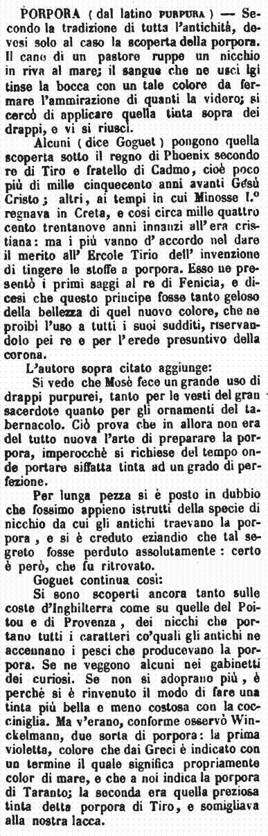 | Porpora (color di porpora) - Secondo la tradizione di tutta l'Antichità si deve al solo caso la scoperta di questo bel colore. Il cane d'un pastore pressato dalla fame, avendo rotto sulla riva del Mare una conchiglia, il sangue che n'uscì gli tinse la gola d'un tal colore che rapì di ammirazione quelli, i quali lo viddero. Si cercarono i mezzi di applicar quel sangue su i drappi e vi riuscirono alcuni. L'onore dell'invenzione di tingere i drappi in porpora è dovuto all'Ercole Tirio. Ne presentò i primi saggi al Re di Fenicia; e questo Principe, per quanto dicesi, fu sì geloso della bellezza di questo novo colore, che ne proibì l'uso a tutti i suoi sudditi, riservandolo per i Re, e per l'Erede presuntivo della Corona.