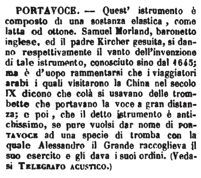 | Portavoce - Quest'istrumento è composto di una sostanza elastica, come latta od ottone. Samuel Morland, baronetto inglese, ed il padre Kircher gesuita, si danno respettivamente il vanto dell'invenzione di tale istrumento, conosciuto sino dal 1645; ma è d'uopo rammentarsi che i viaggiatori arabi i quali visitarono la China nel secolo IX dicono che colà si usavano delle trombette che portavano la voce a gran distanza; e poi, che il detto istrumento è antichissimo, se pure vuolsi dar nome di portavoce ad una specie di tromba con la quale Alessandro il Grande raccoglieva il suo esercito e gli dava i suoi ordini. (Vedasi Telegrafo acustico). [immagine] |