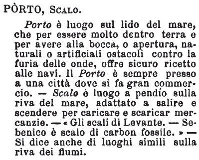 | Porto, Scalo - Porto è luogo sul lido del mare, che per essere molto dentro terra e per avere alla bocca, o apertura, naturali o artificiali ostacoli contro la furia delle onde, offre sicuro ricetto alle navi. Il Porto è sempre presso a una città dove si fa gran commercio. - Scalo è luogo a pendio sulla riva del mare, adattato a salire e scendere per caricare e scaricar mercanzie. - « Gli scali di Levante. - Sebenico è scalo di carbon fossile. » - Si dice anche di luoghi simili sulla riva dei fiumi. [immagine] |