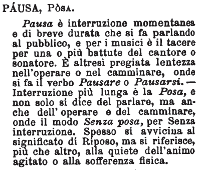 | Pausa, Posa - Pausa è interruzione momentanea e di breve durata che si fa parlando al pubblico, e per i musici è il tacere per una o più battute del cantore o sonatore. E' altresì pregiata lentezza nell'operare o nel camminare, onde si fa il verbo Pausare o Pausarsi. - Interruzione più lunga è la Posa, e non solo si dice del parlare, ma anche dell'operare e del camminare, onde il modo Senza posa, per Senza interruzione. Spesso si avvicina al significato di Riposo, ma si riferisce, più che altro, alla quiete dell'animo agitato o alla sofferenza fisica. [immagine] |