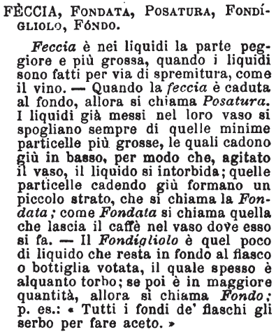 | Feccia, Fondata, Posatura, Fondigliolo, Fondo - Feccia è nei liquidi la parte peggiore e più grossa, quando i liquidi sono fatti per via di spremitura, come il vino. - Quando la feccia è caduta al fondo, allora si chiama Posatura. I liquidi già messi nel loro vaso si spogliano sempre di quelle minime particelle più grosse, le quali cadono giù in basso, per modo che, agitato il vaso, il liquido si intorbida; quelle particelle cadendo giù formano un piccolo strato, che si chiama la Fondata; come Fondata si chiama quella che lascia il caffè nel vaso dove esso si fa. - Il Fondigliolo è quel poco di liquido che resta in fondo al fiasco o bottiglia votata, il quale spesso è alquanto torbo; se poi è in maggiore quantità, allora si chiama Fondo; p. es.: « Tutti i fondi de' fiaschi gli serbo per fare aceto. » [immagine] |