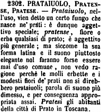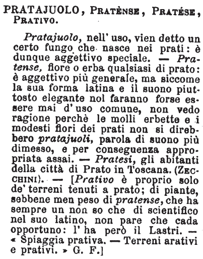 | Pratajuolo, Pratense, Pratese, Prativo - Pratajuolo, nell'uso, vien detto un certo fungo che nasce nei prati: è dunque aggettivo speciale. - Pratense, fiore o erba qualsiasi di prato: è aggettivo più generale, ma siccome la sua forma latina e il suono piuttosto elegante nol faranno forse essere mai d'uso comune, non vedo ragione perché le molli erbette e i modesti fiori dei prati non si direbbero pratajuoli, parola di suono più dimesso, e per conseguenza appropriata assai. - Pratesi, gli abitanti della città di Prato in Toscana. (Zecchini). - [Prativo è proprio solo de' terreni tenuti a prato; di piante, sebbene men peso di pratense, che ha sempre un non so che di scientifico nel suo latino, non pare che cada opportuno: l'ha però il Lastri. - «Spiaggia prativa. - Terreni arativi e prativi.» G. F.] [immagine] |
