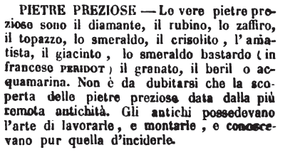 | Pietre preziose - Le vere pietre preziose sono il diamante, il rubino, lo zaffiro, il topazzo, lo smeraldo, il crisolito, l'amatista, il giacinto, lo smeraldo bastardo (in francese peridot) il granato, il beril o acquamarina. Non è da dubitarsi che la scoperta delle pietre preziose data dalla piu remota antichità. Gli antichi possedevano l'arte di lavorarle, e montarle, e conoscevano pur quella d'inciderle. [immagine] |