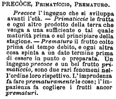 | Precoce, Primaticcio, Prematuro - Precoce l'ingegno che si sviluppa avanti l'età. - Primaticcie le frutta e ogni altro prodotto della terra che venga a una sufficiente o tal quale maturità prima o sul principiare della stagione. - Prematuro il frutto colto prima del tempo debito, e ogni altra cosa spinta a un dato termine prima di essere in punto o preparata, Un ingegno precoce e un bel frutto primaticcio, sono due rari fenomeni nell'ordine loro rispettivo. L'imprudenza fa fare prematuramente le cose; l'impazienza fa cogliere i frutti ancor prematuri. [immagine] |
