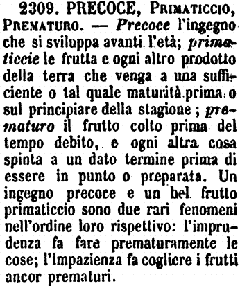 | Precoce, Primaticcio, Prematuro - Precoce l'ingegno che si sviluppa avanti l'età; primaticcie le frutta e ogni altro prodotto della terra che venga a una sufficiente o tal quale maturità prima o sul principiare della stagione; prematuro il frutto colto prima del tempo debito, e ogni altra cosa spinta a un dato termine prima di essere in punto o preparata. Un ingegno precoce e un bel frutto primaticcio sono due rari fenomeni nell'ordine loro rispettivo: l'imprudenza fa fare prematuramente le cose; l'impazienza fa cogliere i frutti ancor prematuri. [immagine] |