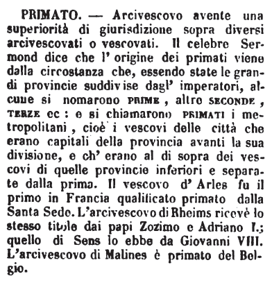 | Primato - Arcivescovo avente una superiorità di giurisdizione sopra diversi arcivescovati o vescovati. Il celebre Sermond dice che l'origine dei primati viene dalla circostanza che, essendo state le grandi provincie suddivise dagl'imperatori alcune si nomarono prime, altre seconde, terze ec: e si chiamarono primati i metropolitani, cioè i vescovi delle città che erano capitali della provincia avanti la sua divisione, e ch'erano al di sora dei vescovi di quelle provincie inferiori e separate dalla prima. Il vescovo d'Arles fu il primo in Francia qualificato primato dalla Santa Sede. L'arcivescovo di Rheims ricevè lo stesso titolo dai papi Zozimo e Adriano I.; quello di Sens lo ebbe da Giovanni VIII. L'arcivescovo di Malines è primato del Belgio. [immagine] |