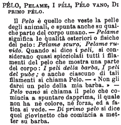 | Pelo, Pelame, I peli, Pelo vano, Di primo pelo - Il Pelo è quello che veste la pelle degli animali, e spunta anche su qualche parte del corpo umano. - Pelame significa le qualità esteriori o fisiche del pelo: Pelame scuro, Pelame ruvido. Quando si dice i peli, si considerano quasi spicciolati tutti i filamenti del pelo che mostra una parte del corpo: I peli della barba, I peli del pube; e anche ciascuno di tali filamenti si chiama Pelo. - « Non gli darei un pelo della mia barba. » - Pelo vano si chiama il pelo che comincia a spuntare dapprima, il quale non ha nè colore nè forza, ed a fatica si vede. - Di primo pelo si dice quel giovinetto che comincia a metter su barba. [immagine] |