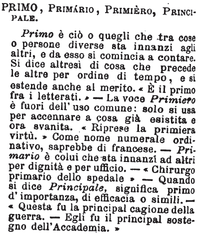 | Primo, Primario, Primiero, Principale - Primo è ciò o quegli che tra cose o persone diverse sta innanzi agli altri, e da esso si comincia a contare. Si dice altresì di cosa che precede le altre per ordine di tempo, e si estende anche al merito. «E' il primo fra i letterati.» - La voce Primiero è fuori dall'uso comune: solo si usa per accennare a cosa già esistita e ora svanita. «Riprese la primiera virtù.» Come nome numerale ordinativo, saprebbe di francese. - Primario è colui che sta innanzi ad altri per dignità e per ufficio. - «Chirurgo primario dello spedale» - Quando si dice Principale, significa primo d'importanza, di efficacia o simili. - «Questa fu la principal cagione della guerra. - Egli fu il principal sostegno dell'Accademia.» [immagine] |