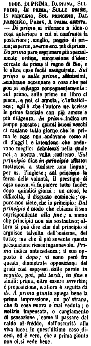 | Di prima, Da prima, Sul primo, In prima, Sulle prime, In principio, Sul principio, Dal principio, Prima, A prima giunta - Di prima si riferisce a idea o cosa anteriore a cui si confronta la posteriore; meglio, peggio di prima; saperne, averne ecc. più di prima. Da prima pare esprimere più specialmente ordine, successione d'idee: cercate da prima il regno di Dio, e le altre cose facili asseguirete. Sul primo e sulle prime, affinissimi, sembrano accennare a cosa che poi non si sviluppa conseguentemente: sul primo, sulle prime un libro ci piace, e poi ci annoia, c'infastidisce; egli è che l'autore ne scrisse le prime facciate con più amore e più diligenza. In prima indica un tempo passato; quanti buoni vecchi ci cantano tutto giorno che in prima le cose non andavano come al dì d'oggi! e intendono che andavano meglio: debolezza nella quale noi a nostra volta cadremo. Sul principio dice in principio affatto: mettetevi a studiare una lingua, per es. l'inglese; sul principio la forza della volontà, il prestigio di cosa nuova vi fa parere tutto facile; dopo quindici giorni, un mese, le difficoltà, il disgusto comincia; eppure non siete che in principio. Dal principio è modo che chiama il suo corrispondente alla fine; a meno che principio non sia sostantivo; allora si può dire che dal principio si arguisce talvolta dell'insieme, del tutto; ma che il più sovente questa presunzione riesce ingannevole. Prima indica antecedenza; il suo opposto è dopo; vi sono però fra questa diametrale opposizione dei gradi così espressi dalle parole in seguito, poi, più tardi, in fine e simili: prima, oltre essere avverbio, è preposizione, e allora è seguita da di. A prima giunta spiega bene la prima impressione, un po' strana, che fa cosa nuova o mai veduta; o notizia impensata, o cangiamento di sensazione, come il passare dal caldo al freddo, dall'oscurità alla viva luce; in quest'ultimo caso dicesi, ed è vero, che a prima giunta non ci si vede bene. [immagine] |