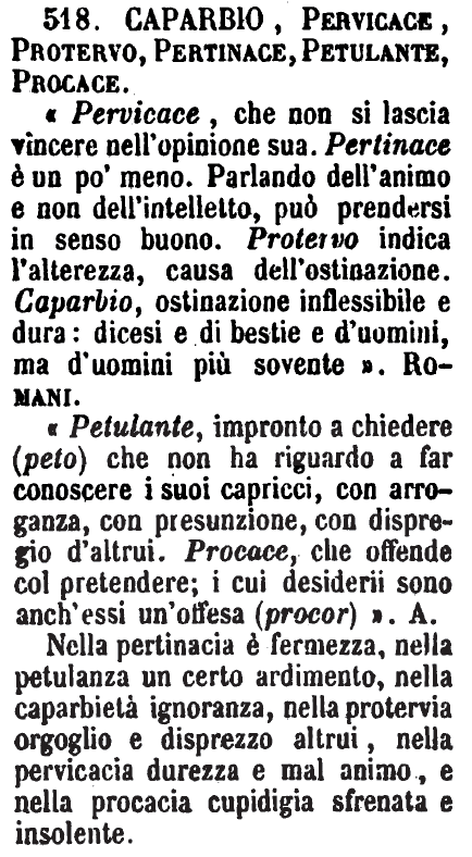Caparbio, Pervicace, Protervo, Pertinace, Petulante, Procace - «Pervicace, che non si lascia vincere nell'opinione sua. Pertinace è un po' meno. Parlando dell'animo e non dell'intelletto, può prendersi in senso buono. Protervo indica l'alterezza, causa dell'ostinazione. Caparbio, ostinazione inflessibile e dura: dicesi e di bestie e d'uomini, ma d'uomini più sovente». Romani.