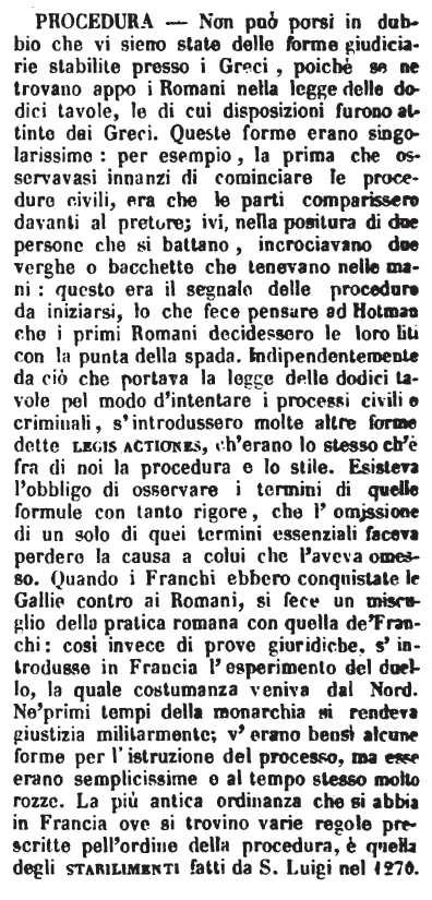 | Procedura - Non può porsi in dubbio che vi sieno state delle forme giudiciarie stabilite presso i Greci, poichè se ne trovano appo i Romani nella legge delle dodici tavole, le di cui disposizioni furono attinte dai Greci. Queste forme erano singolarissime: per esempio, la prima che osservavasi innanzi di cominciare le procedure civili, era che le parti comparissero davanti al pretore; ivi, nella positura di due persone che si battano, incrociavano due verghe o bacchette che tenevano nelle mani: questo era il segnale delle procedure da iniziarsi, lo che fece pensare ad Hotman che i primi Romani decidessero le loro liti con la punta della spada. Indipendentemente da ciò che portava la legge delle dodici tavole pel modo d'intentare i processi civili e criminali, s'introdussero molte altre forme dette legis actiones, ch'erano lo stesso ch'è fra di noi la procedura e lo stile. Esisteva l'obbligo di osservare i termini di quelle formule con tanto rigore, che l'omissione di un solo di quei termini essenziali faceva perdere la causa a colui che l'aveva omesso. Quando i Franchi ebbero conquistate le Gallie contro ai Romani, si fece un miscuglio della pratica romana con quella de' Franchi: così invece di prove giuridiche, s'introdusse in Francia l'esperimento del duello, la quale costumanza veniva dal Nord. Ne' primi tempi della monarchia si rendeva giustizia militarmente: v'erano bensì alcune forme per l'istruzione del processo, ma esse erano semplicissime e al tempo stesso molto rozze. La più antica ordinanza che si abbia in Francia ove si trovino varie regole prescritte pell'ordine della procedura, è quella degli stabilimenti fatti da S. Luigi nel 1270. [immagine] |