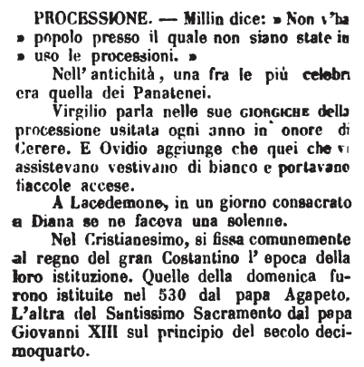 Nell'antichità, una fra le più celebri era quella dei Panatenei. Virgilio parla nelle sue giorgiche della processione usitata ogni anno in onore di Cerere. E Ovidio aggiunge che quei che vi assistevano vestivano di bianco e portavano fiaccole accese. A Lacedemone, in un giorno consacrato a Diana se ne faceva una solenne. Nel Cristianesimo, si fissa comunemente al regno del gran Costantino l'epoca della loro istituzione. Quelle della domenica furono istituite nel 530 dal papa Agapeto. L'altra del Santissimo Sacramento dal papa Giovanni XIII sul principio del secolo decimoquarto. [immagine] |