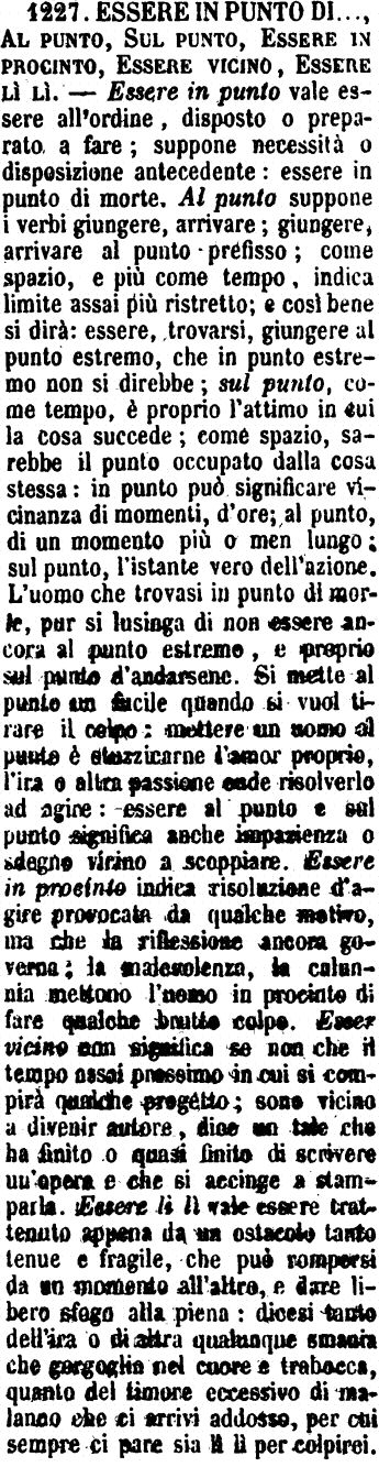 | Essere in punto di…, Al punto, Sul punto, Essere in procinto, Essere vicino, Essere lì lì - Essere in punto vale essere all'ordine, disposto o preparato a fare; suppone necessità o disposizione antecedente: essere in punto di morte. Al punto suppone i verbi giungere, arrivare; giungere, arrivare al punto prefisso; come spazio, e più come tempo, indica limite assai più ristretto; e così bene si dirà: essere, trovarsi, giungere al punto estremo, che in punto estremo non si direbbe; sul punto, come tempo, è proprio l'attimo in cui la cosa succede; come spazio, sarebbe il punto occupato dalla cosa stessa: in punto può significare vicinanza di momenti, d'ore; al punto, di un momento più o men lungo; sul punto, l'istante vero dell'azione. L'uomo che trovasi in punto di morte, pur si lusinga di non essere ancora al punto estremo, e proprio sul punto d'andarsene. Si mette al punto un fucile quando si vuol tirare il colpo: mettere un uomo al punto è stuzzicarne l'amor proprio, l'ira o altra passione onde risolverlo ad agire: essere al punto e sul punto significa anche impazienza o sdegno vicino a scoppiare. Essere in procinto indica risoluzione d'agire provocata da qualche motivo, ma che la riflessione ancora governa; la malevolenza, la calunnia mettono l'uomo in procinto di fare qualche brutto colpo. Esser vicino non significa se non che il tempo assai prossimo in cui si compirà qualche progetto; sono vicino a divenir autore, dice un tale che ha finito o quasi finito di scrivere un'opera e che si accinge a stamparla. Essere lì lì vale essere trattenuto appena da un ostacolo tanto tenue e fragile, che può rompersi da un momento all'altro, e dare libero sfogo alla piena: dicesi tanto dell'ira o di altra qualunque smania che gorgoglia nel cuore e trabocca, quanto del timore eccessivo di malanno che ci arrivi addosso, per cui sempre ci pare sia lì lì per colpirci. [immagine] |