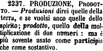 | Produzione, Prodotto - Produzioni direi quelle della terra, e se vuolsi anco quelle dello spirito; prodotto, quello della moltiplicazione di due numeri: ma è più sovente usato come participio che come sostantivo. [immagine] |
