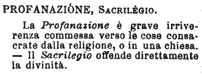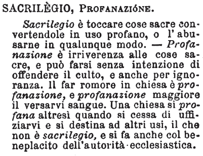 | Sacrilegio, Profanazione - Sacrilegio è toccare cose sacre convertendole in uso profano, o l'abusarne in qualunque modo. - Profanazione è irriverenza alle cose sacre, e può farsi senza intenzione di offendere il culto, e anche per ignoranza. Il far romore in chiesa è profanazione, e profanazione maggiore il versarvi sangue. Una chiesa si profana altresì quando si cessa di uffiziarvi e si destina ad altri usi, il che non è sacrilegio, e si fa anche col beneplacito dell'autorità ecclesiastica. [immagine] |