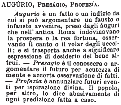 | Augurio, Presagio, Profezia - Augurio è un fatto o un indizio da cui si può argomentare un fausto o infausto avvenire, preso dagli áuguri che nell'antica Roma indovinavano la prospera o la rea fortuna, osservando il canto o il volar degli uccelli; e si trasporta anche a significare espressione di desiderio del bene altrui. - Presagio è il conoscere o argomentare il futuro per acutezza di mente e accorta osservazione dei fatti. - Profezia è annunziare futuri eventi per ispirazione divina. Il popolo, per altro, lo dice abusivamente di ogni predizione fatta a caso. [immagine] |
