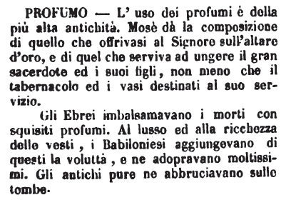 | Profumo - L'uso dei profumi è della più alta antichità. Mosè dà la composizione di quello che offrivasi al Signore sull'altare d'oro, e di quel che serviva ad ungere il gran sacerdote ed i suoi figli, non meno che il tabernacolo ed i vasi destinati al suo servizio.