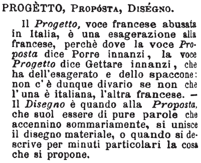 | Progetto, Proposta, Disegno - Il Progetto, voce francese abusata in Italia, è una esagerazione alla francese, perchè dove le voce Proposta dice Porre innanzi, la voce Progetto dice Gettare innanzi, che ha dell'esagerato e dello spaccone: non c'è dunque divario se non che l'una è italiana, l'altra francese. - Il Disegno è quando alla Proposta, che suol essere di pure parole che accennino sommariamente, si unisce il disegno materiale, o quando si descrive per minuti particolari la cosa che si propone. [immagine] |