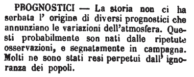 | Prognostici - La storia non ci ha serbata l'origine di diversi prognostici che annunziano le variazioni dell'atmosfera. Questi probabilmente son nati dalle ripetute osservazioni, e segnatamente in campagna. Molti ne sono stati resi perpetui dall'ignoranza dei popoli. [immagine] |